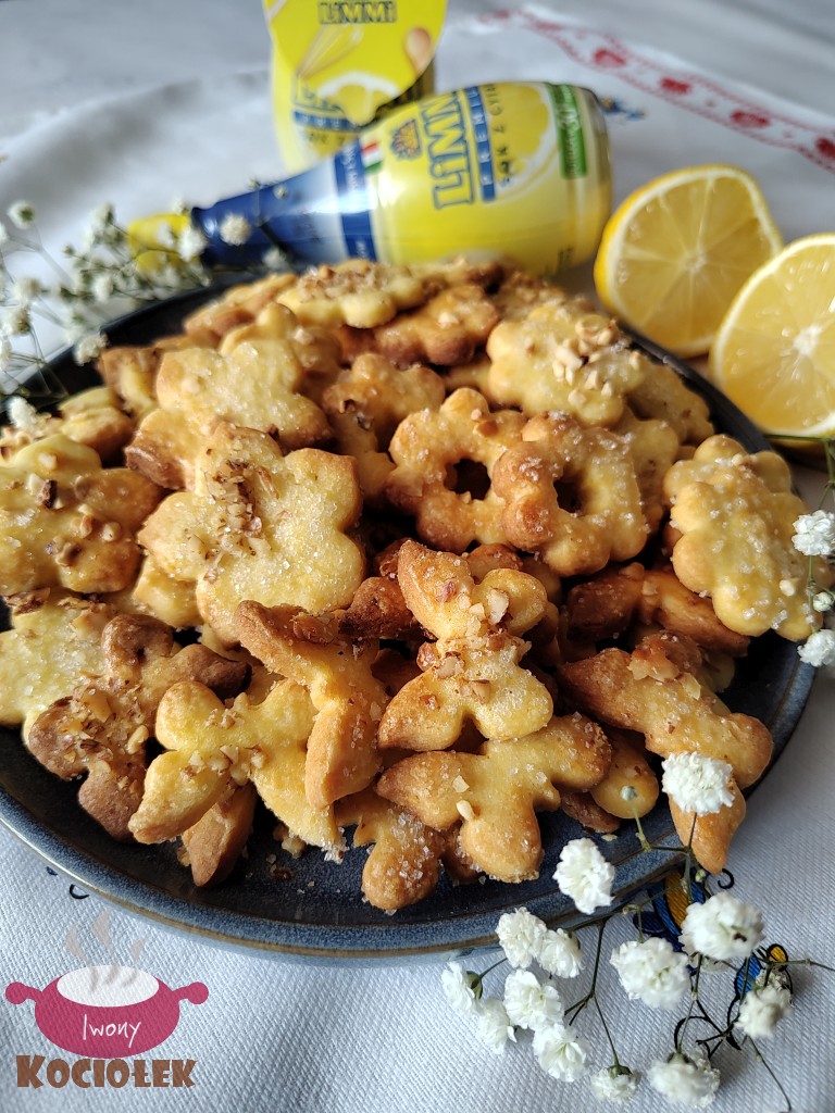 Z podanych składników zagnieść gładkie ciasto lub wyrobić za pomocą robota. Ciasto owinąć w folię i schłodzić w lodówce przez 1 godzinę. Po tym czasie ciasto wyjąć z lodówki, wyłożyć na podsypaną mąką stolnicę i rozwałkować na grubość około 5 mm. Małymi foremkami wycinać ciasteczka, które następnie należy układać na wyłożonej pergaminem formie do pieczenia. Przed włożeniem ciasteczek do piekarnika posmarować je białkiem, posypać cukrem kryształem i drobno posiekanymi orzechami. Piec 10 min w temp. 180 °C.